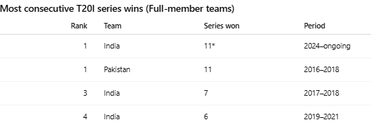 Sustaining success over time is harder still in a format built on fluctuation. Squads rotate, conditions change and momentum fades quickly. Winning 11 consecutive T20I series goes beyond form. It points to a side that adjusts fast, absorbs pressure and keeps standards intact regardless of venue or opposition. That this run matches the best achieved by a full member nation, and goes beyond India’s own previous streaks, speaks to the depth of the current set-up.